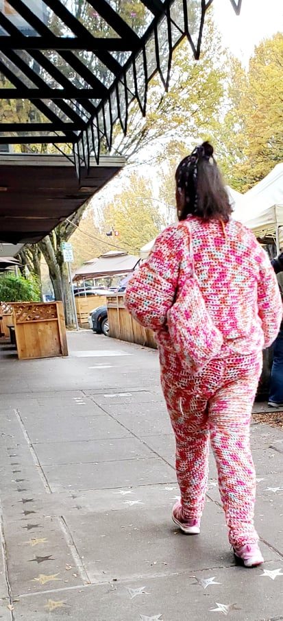 Женщина в костюме, связанном крючком. Сумочка прилагается!