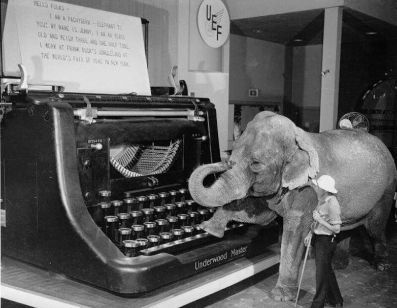 Слон печатает сообщение на гигантской пишущей машинке во время Всемирной ярмарки 1940 года в Нью-Йорк.