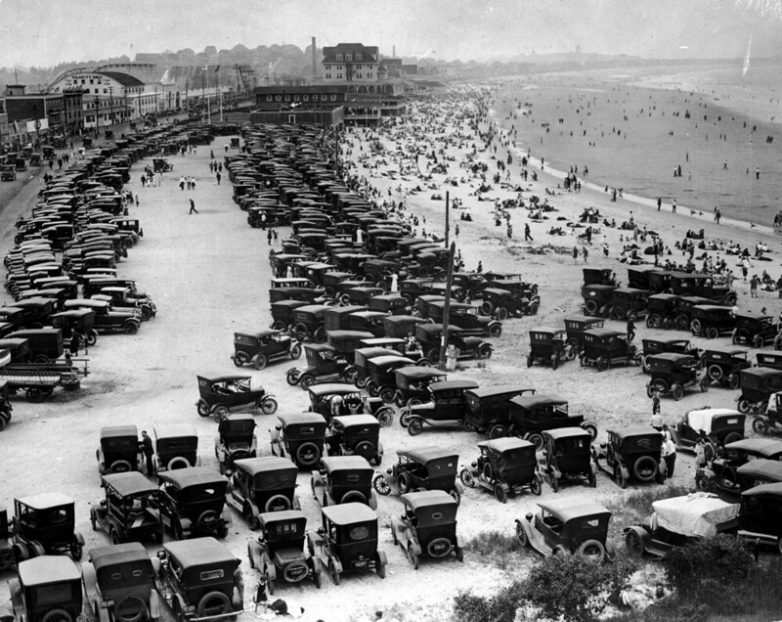 Припаркованные автомобили на пляже Нантаскет Бич, 1920–е годы, Массачусетс, США