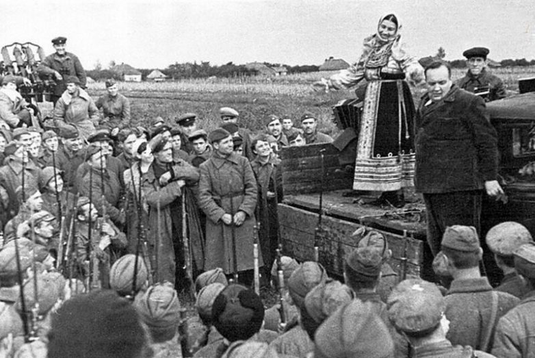 Лидия Русланова выступает перед бойцами. Фронтовая бригада московских артистов на Южном фронте, 1941 год