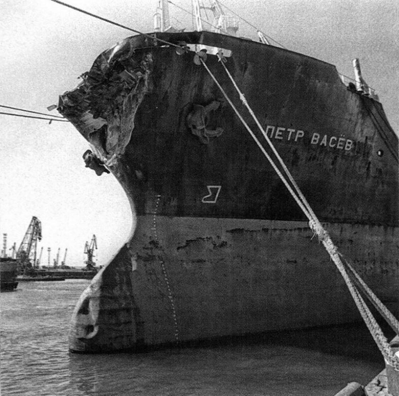 Сухогруз «Пётр Васёв» после столкновения 31.08 86 года с пассажирским пароходом «Адмирал Нахимов», недалеко от Новороссийска, в ходе которого погибло 423 человека