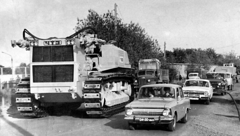 Сверхтяжёлый промышленный трактор Т-800 перегоняют своим ходом с завода, для дальнейшей сборки. 1983 г.