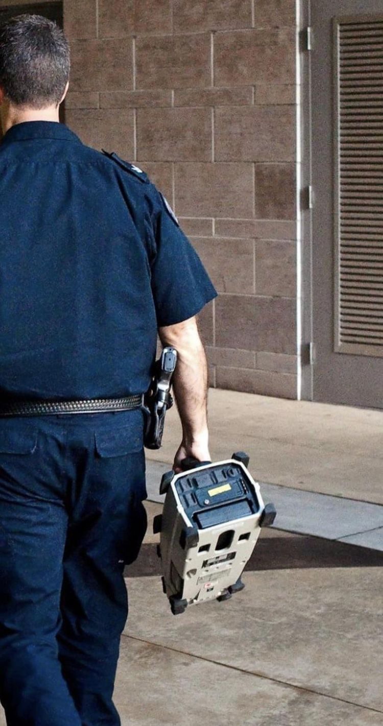 Вопрос: «Электроприбор, который использует полицейский, размером с большую буханку хлеба. Имеет аккумуляторную батарею, ручку для переноски и защитные уголки»