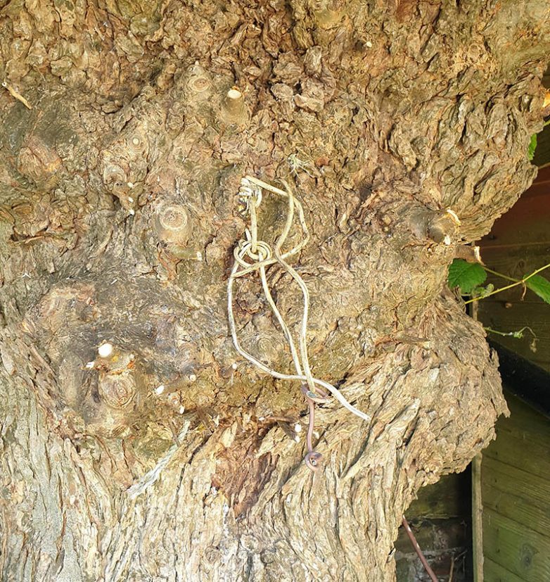 Вросшая в дерево бельевая веревка. Её не снимали десятки лет подряд.