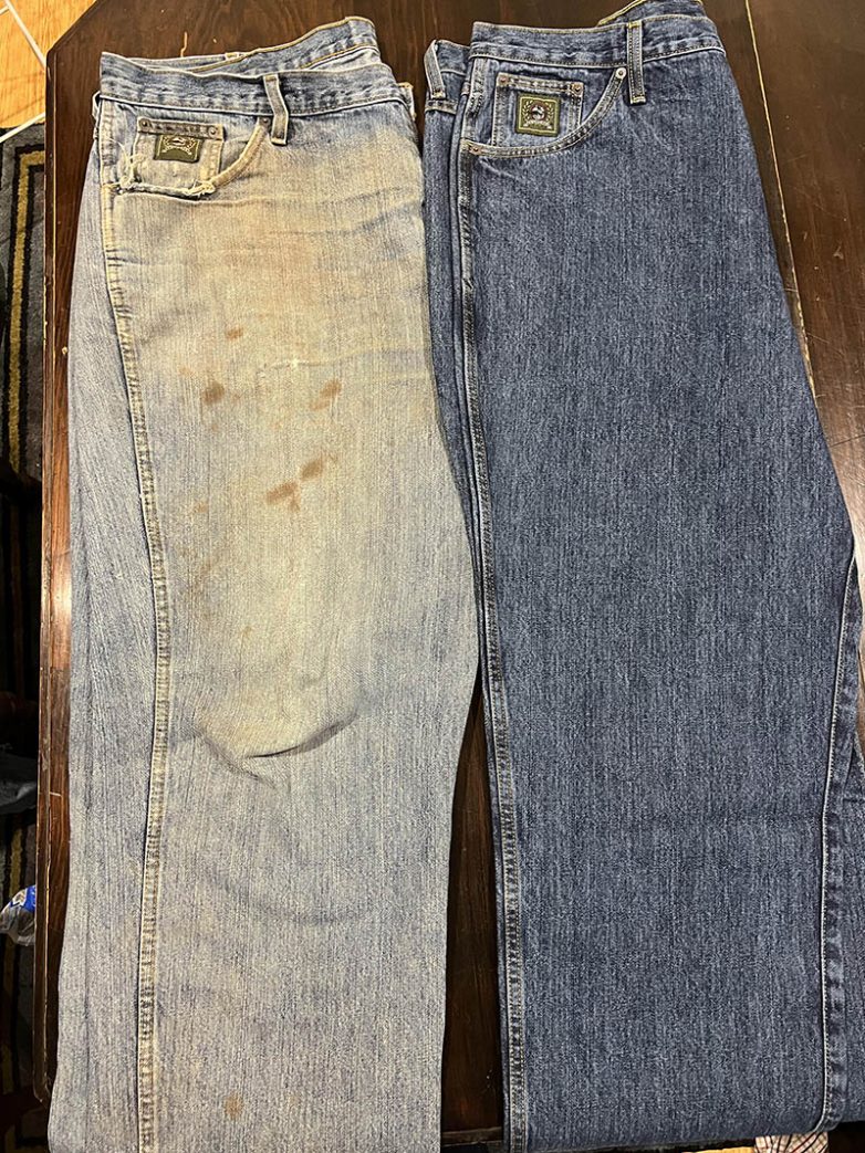 “Я обычный фермер. Вот джинсы, которые я круглый год ношу каждый день и рядом новые этой же модели.”