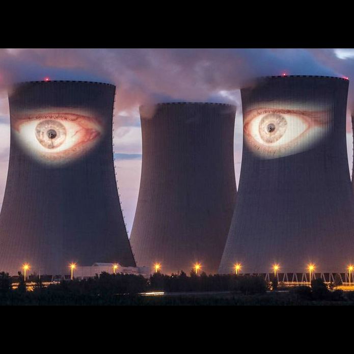 8. Глаза специально спроецировали на охлаждающие башни атомной электростанции. Такой пугающий получился арт-проект.