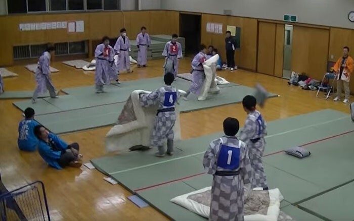 7. В Японии проводится национальный турнир по борьбе подушками. Борцы начинают с того, что притворяются, будто спят на футонах (матрацах). Но когда раздается сигнал, они вскакивают на ноги и бегут за подушкой. Это некая смесь «вышибалы» и шахмат — команды бросают друг в друга подушки, защищая «короля».