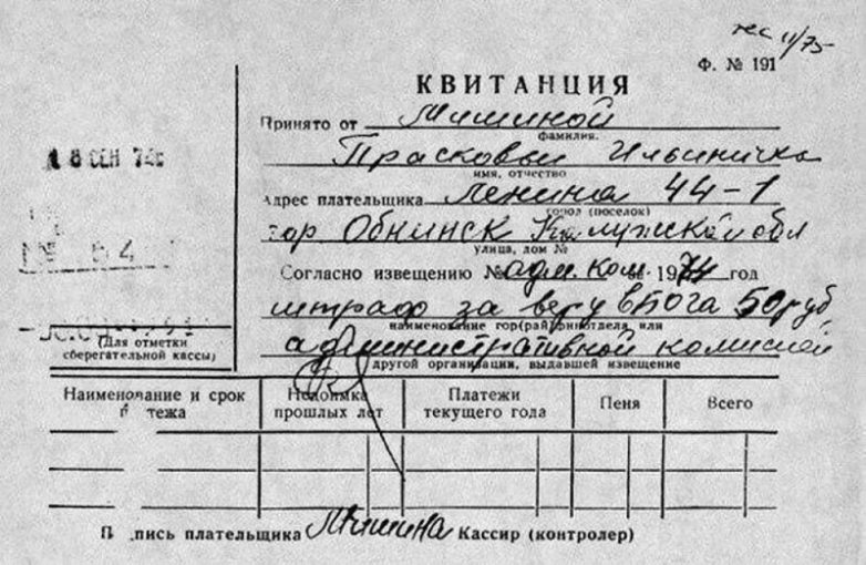 Квитанция о штрафе в 50 рублей «за веру в Бога». СССР. 1974 год