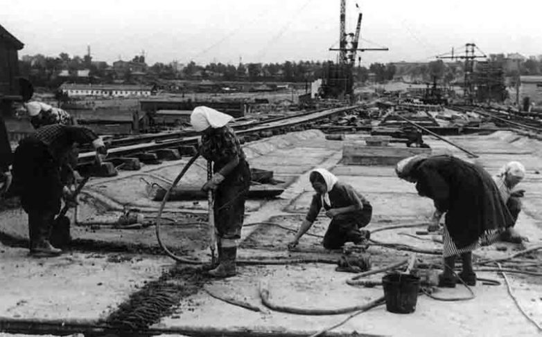 Сроительство Коммунального моста. Работа бетонщиц. Новосибирск, 1953 год