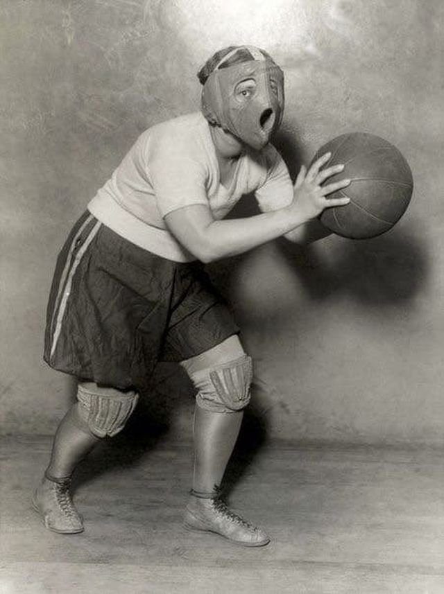 Девушка демонстрирует специальную защитную маску для лица и наколенники для игры в баскетбол. США, 1927 год.