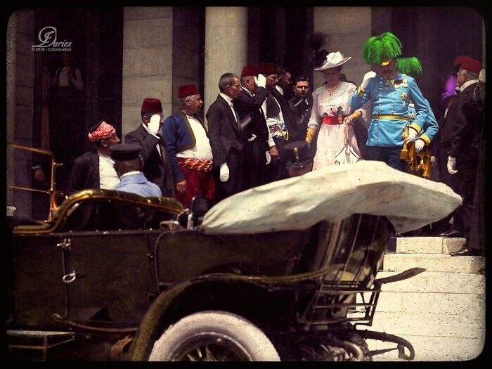 Эрцгерцог Франц Фердинанд и его жена за несколько минут до убийства, приведшее к Первой мировой войне, 1914 год (колоризация)