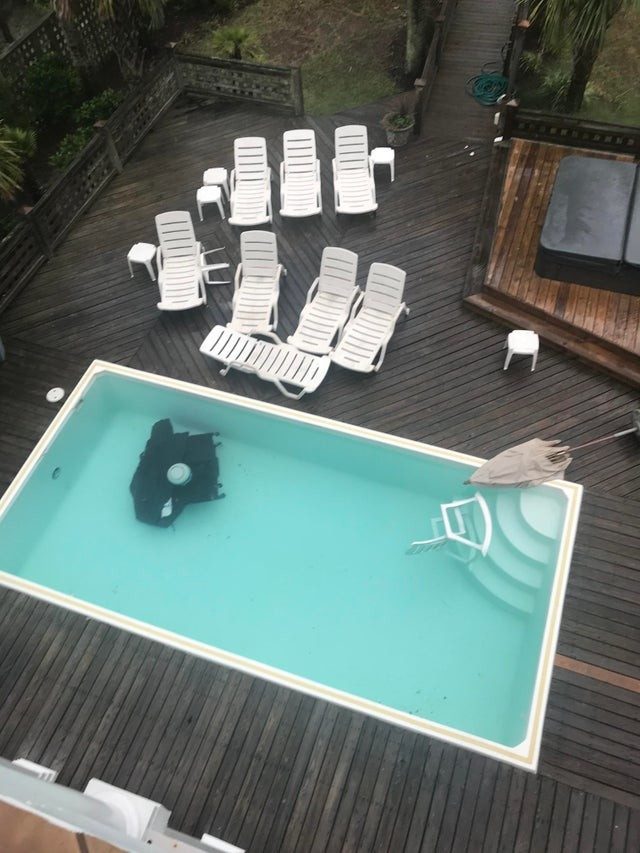 После бури пластиковая мебель осталась на месте. Зато гриль унесло в бассейн!