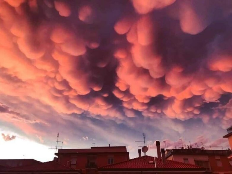 Эти облака известны как мамматусы или «вымяобразные». Они образованы холодным воздухом, который создает карманы, противоположные облакам, поднимающимся через теплый воздух. Из-за своего несколько пугающего вида, их считают предвестниками бури или урагана. Эти облачные скопления длятся в среднем от 15 минут до нескольких часов.