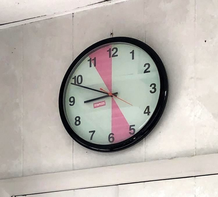 Вопрос: «Эти настенные часы — зелёные с 12-5 и с 6-11, и розовые с 5-6 и 11-12. Такая расцветка что-нибудь означает?»