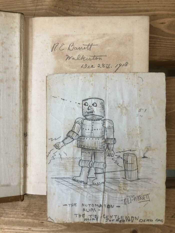 «Это объявление о МОЕМ рождении, которое вышила моя тетя, когда я родилась. Мама передала коробку старых детских вещей в местный комиссионный магазин, и оно случайно попало в эту коробку. Каким-то образом оно добралось до города в нескольких часах езды, где сейчас живу я. Я была потрясена, когда нашла его; я была просто обязана выкупить его обратно. 2 доллара более чем стоили того, чтобы сохранить мое наследие».21. «Нашел рисунок робота в учебнике по химии 1918 года»