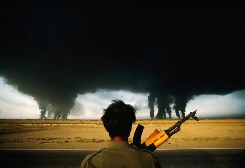 Иранские войска наблюдают, как горят нефтяные месторождения, подожженные иракскими войсками во время войны в Персидском заливе. 1990 год.