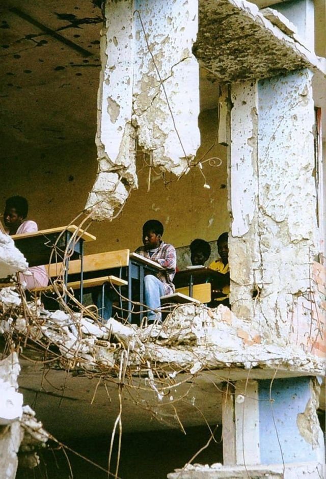 Занятия в разрушенной школе, Ангола, 1997 год.