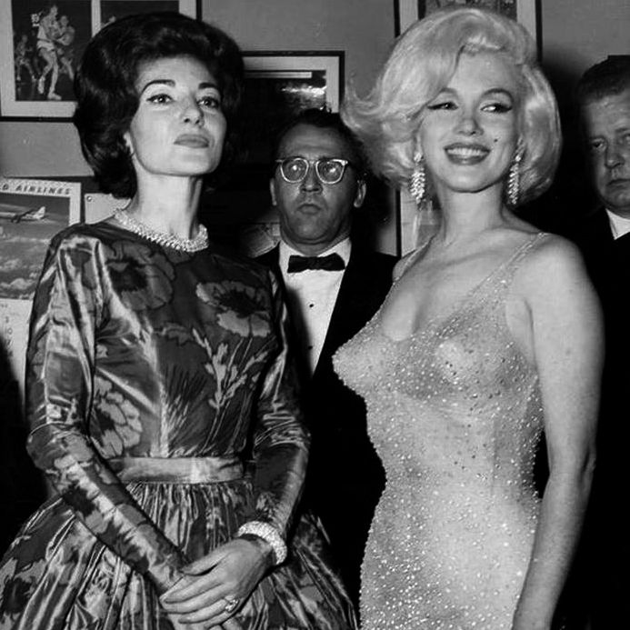 Мария Каллас и Мэрилин Монро в своём теперь уже культовом платье на гала-концерте в честь дня рождения Джона Кеннеди, 1962 год