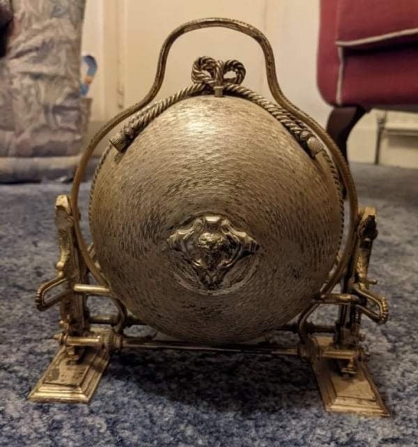 Золотой шар с ножками и ручкой. Шар делится на 2 части, с каждой стороны по крышке