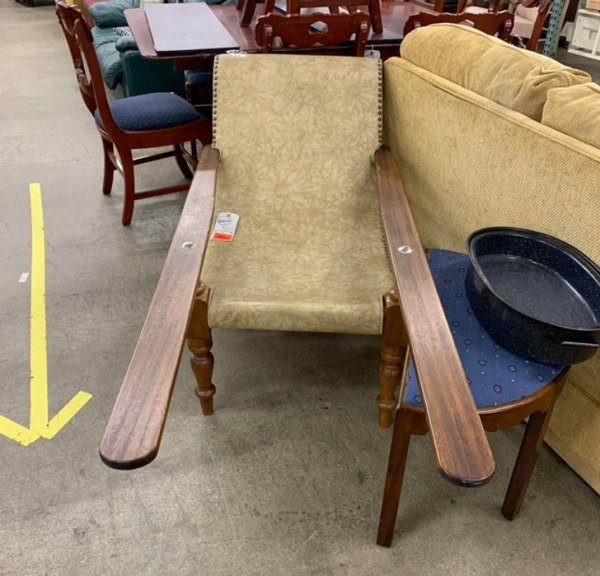 Ответ: Это стул плантатора с наклонной спинкой и удлиненными подлокотниками для ног. Просидев весь день верхом на лошади, плантаторы, приходя домой, садились на стул, закидывая ноги на подлокотники. Таким образом они могли расслабиться и дать ногам отдохнуть.