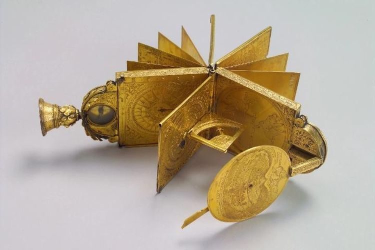 Астрономический набор инструментов 1557 года, содержащий два разных вида солнечных часов, карту мира, десять страниц с выгравированными астрономическими и астрологическими таблицами, семь чистых страниц и магнитный компас
