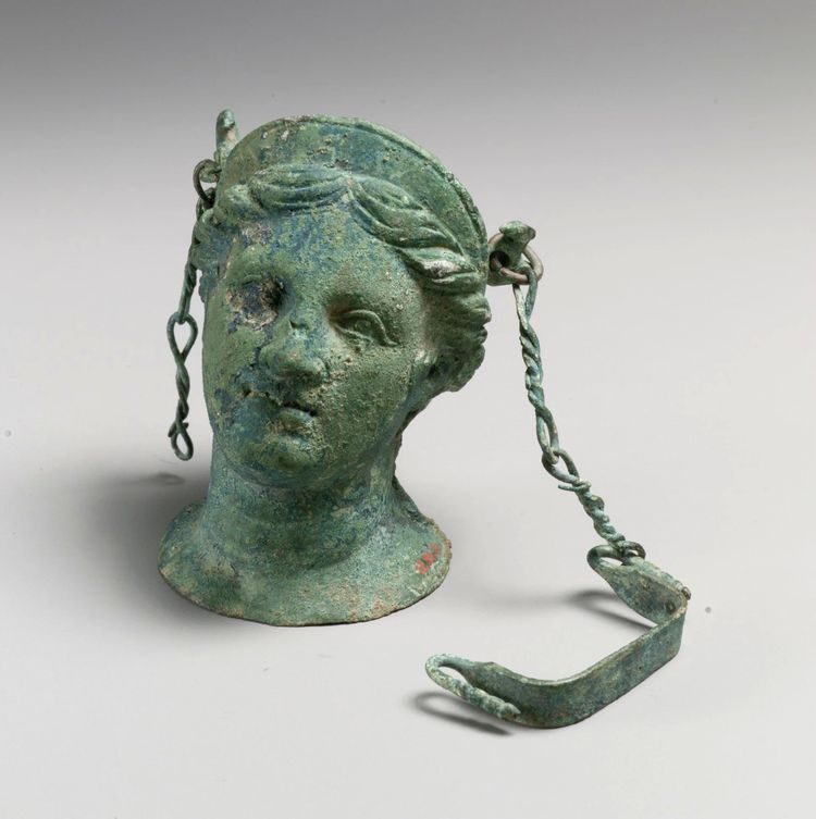 Древний этрусский бронзовый переносной сосуд для косметики в форме женской головы, ок. 4-3 века до нашей эры