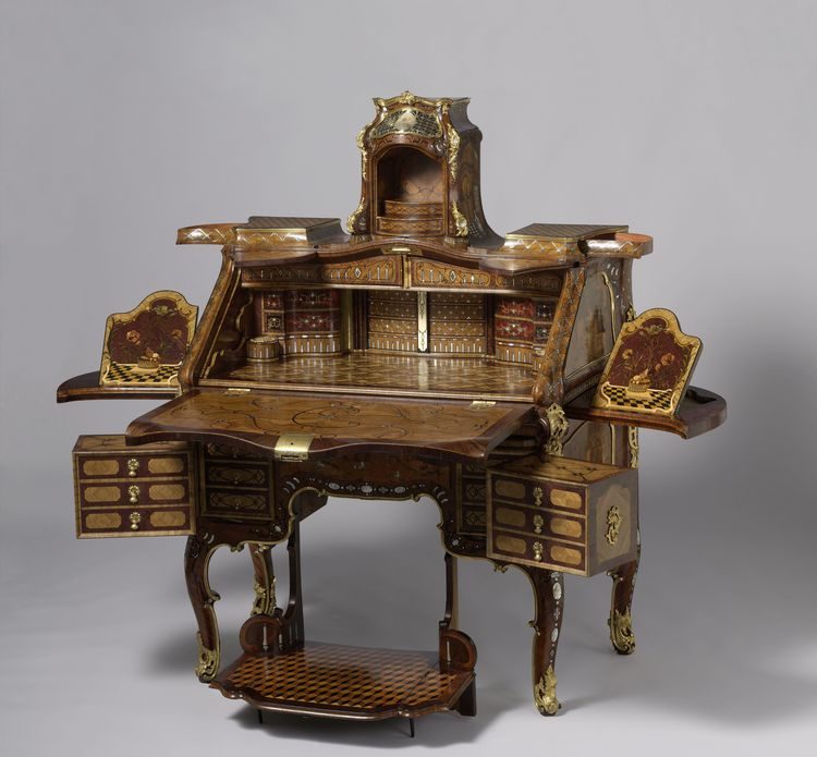 Этот стол имеет множество скрытых отсеков и ящиков и даже включает складную скамью для коленей. Он был сделан для архиепископа Триорского Иоганна Филиппа фон Вальдердорфа, и украшен вверху его портретом и гербом, ок. 1758 года