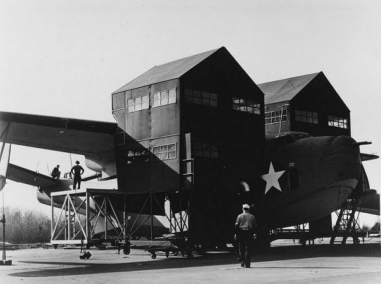 Гидросамолёт PBM-3D на авиазаводе Glenn L. Martin в городе Балтимор штата Мэриленд; 1943-й год. Двигатели самолёта накрыты специальным мобильным укрытием, позволяющим техникам обслуживать двигатели при непогоде.