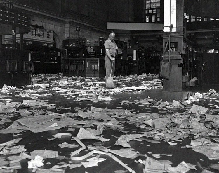 Уборщик подметает пол Нью-Йоркской фондовой биржи после краха Уолл-Стрит в 1929 году