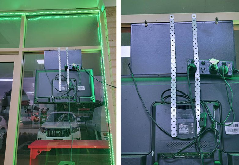 “В местной пиццерии какой-то мастер установил новый телевизор для наружной рекламы”