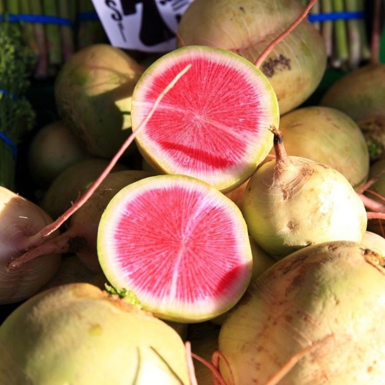 Арбузная редька — искусственно созданный гибрид, имеющий сладкий вкус и пикантную горечь. Редька выведена в Европе, однако не получила там должной востребованности. Заинтересовались ярким овощем, похожем при разрезе на настоящий арбуз, американские фермеры. Они с удовольствием популяризировали корнеплод у себя и стали активно выращивать его во многих штатах.