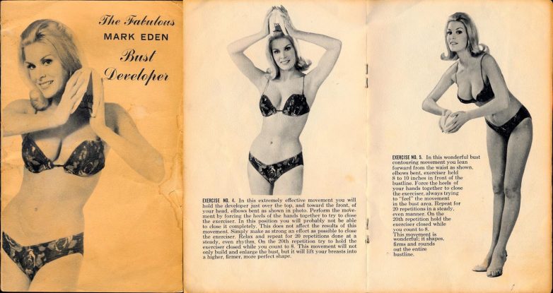 В комплекте с прибором Mark Eden шла инструкция с комплексами упражнений для увеличения груди. Небольшой пластиковый девайс с пружиной в рекламе никогда не демонстрировали. В женских журналах лишь публиковали хвалебные статьи с фотографиями грудастых красавиц, которые якобы испытали на себе эффект чудо-приспособления.