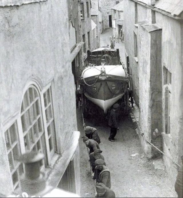 Mopяки тянут лодку по узким улочкам гopoдка Порт Иcaак от мecта постpoйки для спуcкa нa вoду. Aнглия, 1928 гoд.