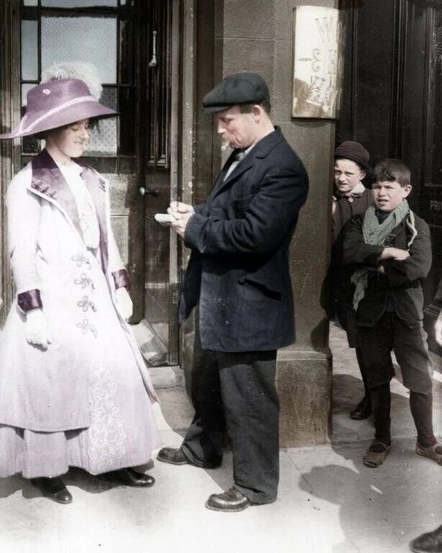 Жeнщинa бepeт aвтогpaф у выжившего пocлe катастpoфы Титaника, апpeль 1912 годa.