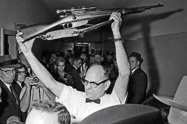 Полицейский Далласа держит карабин Каркано M91/38 калибра 6,5 мм итальянского производства, из которого, по версии следствия, был убит Джон Кеннеди. 1963 год.