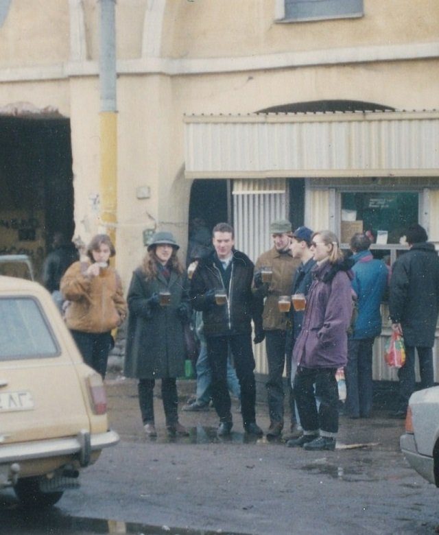 Молодые люди выпиваю пиво на улице, Санкт-Петербург, 1990-е годы.