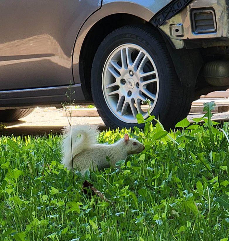 9. “Белки бывают разного цвета, а не только рыжие. Например, вот такая белка-альбинос живет в моем районе.”