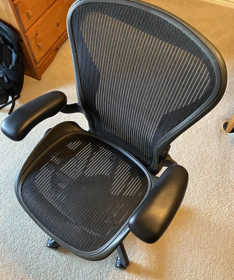 “Кресла Herman Miller достаточно дорого стоят, но они при этом отменного качества. Это кресло я получил после ликвидации фирмы, в которой работал, и оно было сделано в 1999 году.”