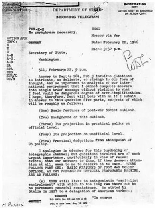 22 февраля 1946 года сотрудник посольства США в СССР Джордж Кеннан отравил телеграмму, в которой обосновал невозможность сотрудничества с СССР. Эта телеграмма послужила началом многолетнему периоду в истории двух стран, известному как «Холодная война» с 1946 по 1991 годы. Полный текст телеграммы вы можете прочитать по ссылке.