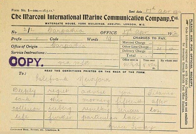 Первую телеграмму о гибели «Титаника» отправили спустя 11 часов после катастрофы. Это сделал Брюс Исмей, который спасся на шлюпке. Текст такой: