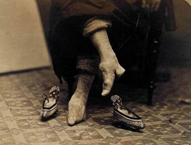 Ох, Китай… Те еще затейники. Больше 1000 лет назад, девочкам от 3 до 10 лет перетягивали ступни, чтобы уподобить их стопы Золушкиной ножке. Называли их «золотые лотосы»В результате получалось уродство, да ещё и с неприятным запахом, а деформация ступней была необратима, так же как и хромота. Многие женщины не могли ходить вовсе, а кто-то мог, но только с посторонней помощью. Самое нелогичное в этом всем то, что женские ножки не видел даже супруг, так как это было под запретом — ходила она в туфельках, в них же и спала. Зато замужем!Ну а дамы, которым повезло и «золотого лотоса» им не досталось, оставалось одно — служить господам. Ввёл эту традицию, кстати, китайский император Тайзонг. Вот сам бы попробовал, а потом женщин калечил, эстет. Традицию запретили только в 1950 году.
