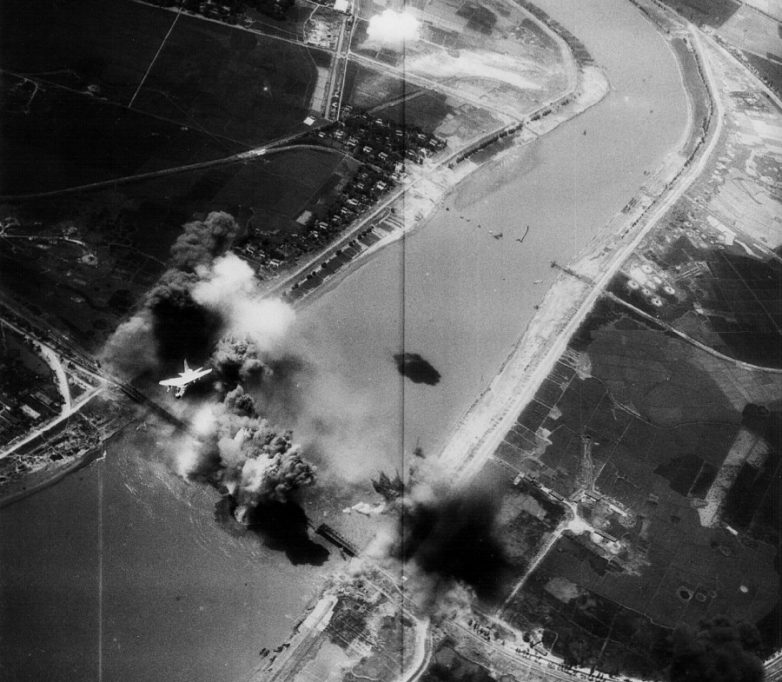 Май 1972 года. Американский штурмовик A-7E VA атакует мост в Северном Вьетнаме в рамках операции «Полузащитник» (Linebacker)