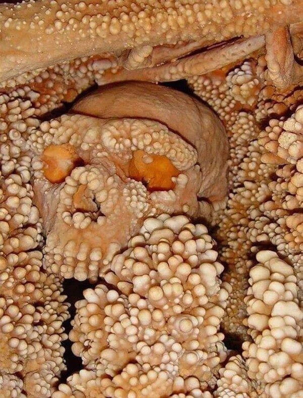 Стены пещеры из песчаника за долгие годы почти поглотили череп