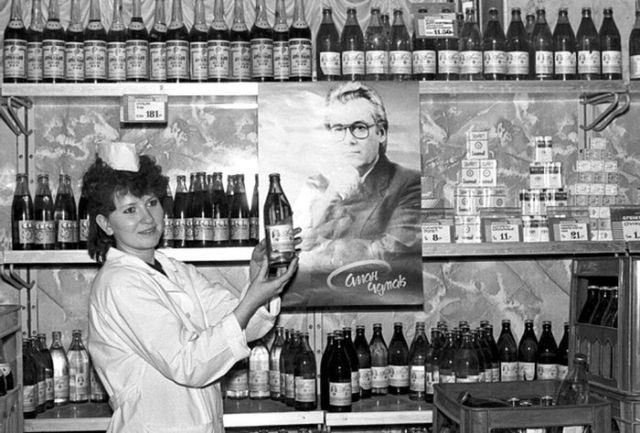 Продавец гастронома «Таганский» предлагает заряженную Аланом Чумаком воду, Москва, 1992
