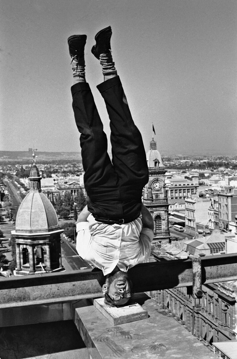 Человек по имени Ааге Педерсон балансирует на голове на крыше в Аделаиде, Австралия, 1965 год