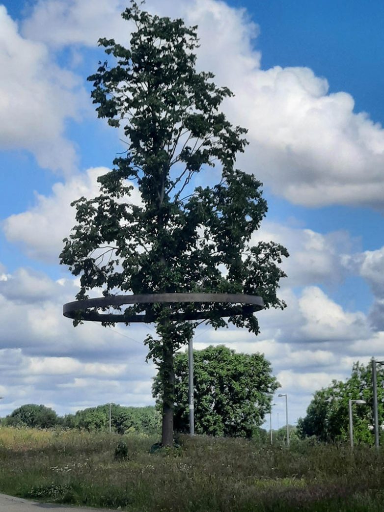 Ответ: Это одно из десяти «деревьев истории» в Олимпийском парке Лондона. Металлические круги — арт-инсталляция, которая выделяет их среди других деревьев парка.
