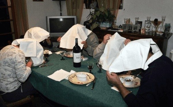 17. «Люди едят традиционную французскую еду из ортоланской овсянки. Белая ткань на их головах предназначена для того, чтобы спрятать их грех, связанный с едой, от Бога»