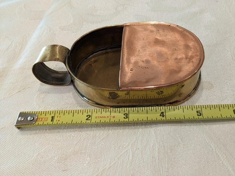 10. Медная или латунная баночка, типа как из-под шпротов. Сбоку приделана ручка.