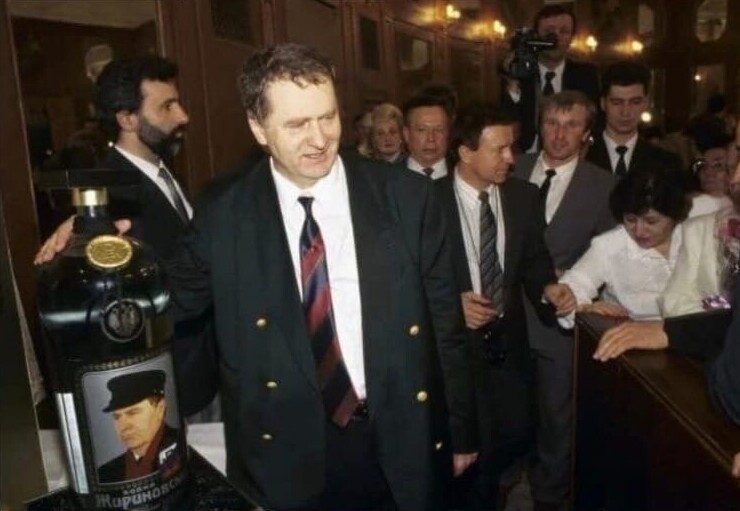 Владимир Жириновский с именной бутылкой водки. На заднем плане Анатолий Кашпировский. 1994 год