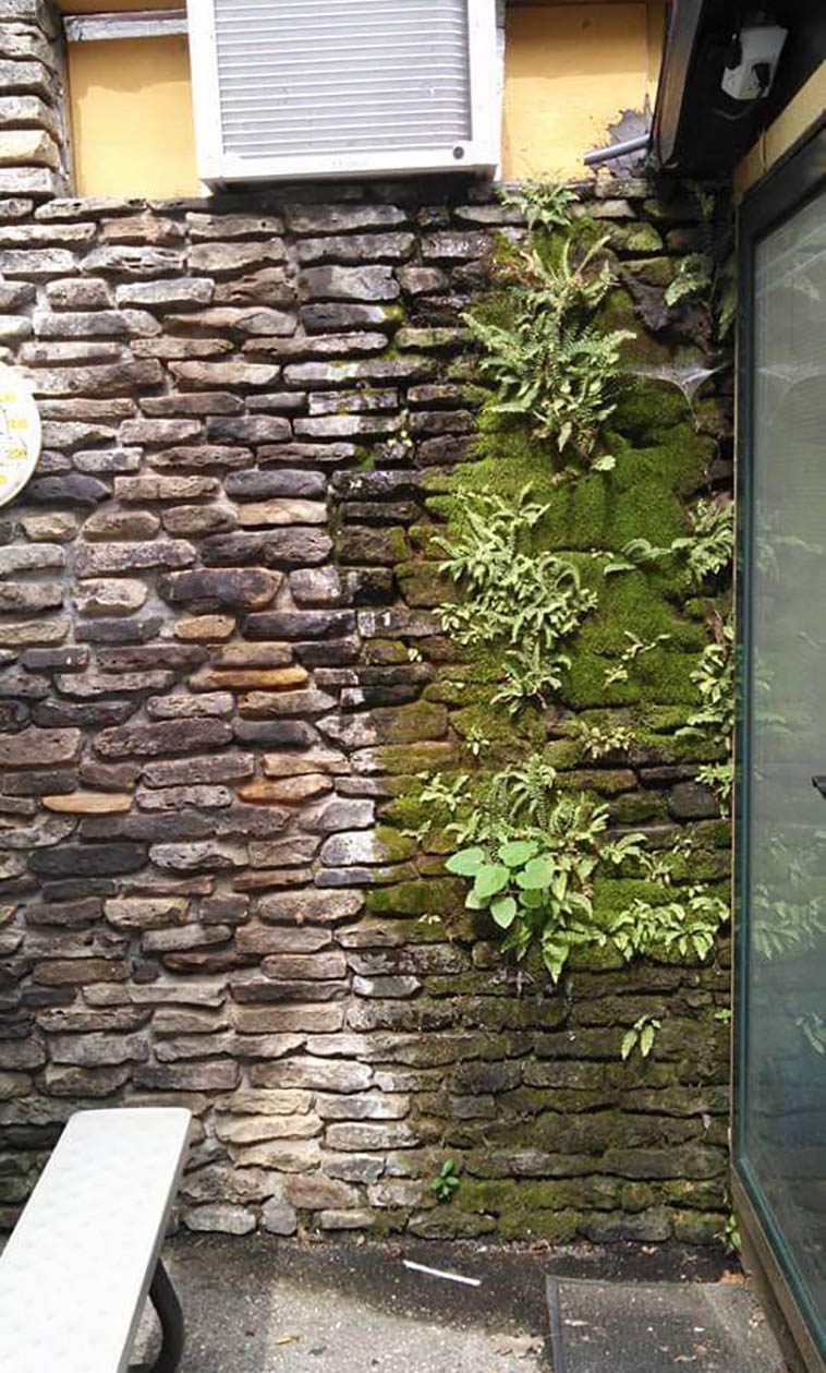 13. С одной стороны по стене стекает конденсат из кондиционера, и благодаря этому на ней выросли растения